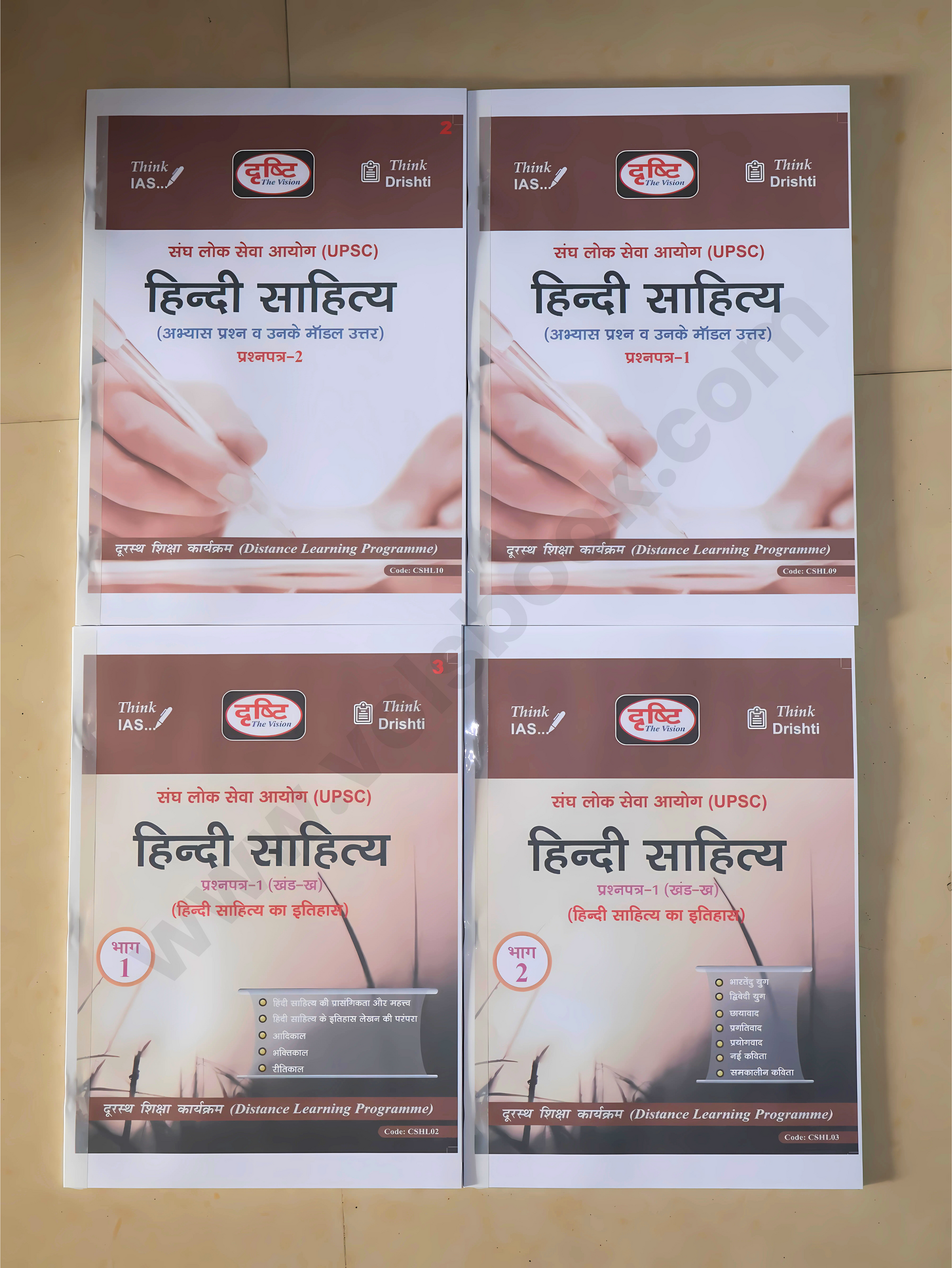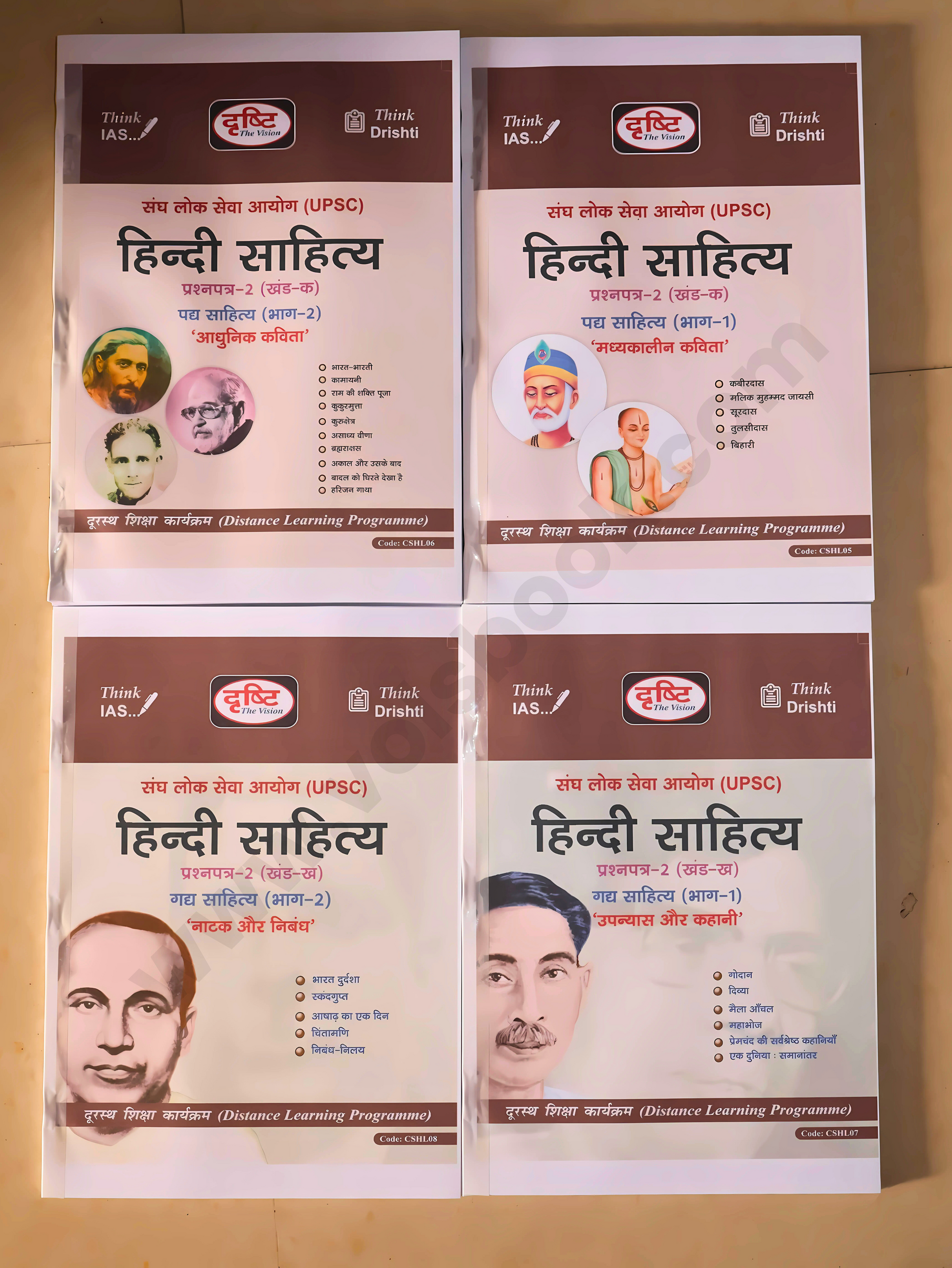 - Drishti IAS द्वारा प्रकाशित "4 Booklet Class Notes" हिंदी साहित्य अध्ययन के लिए एक संपूर्ण संसाधन है। इस सामग्री में निम्नलिखित 4 पुस्तकें शामिल हैं: